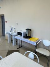 В столовой есть кулер с горячей и холодной водой, микроволновая печь, две раковины для мытья рук, средства для санитарной обработки.